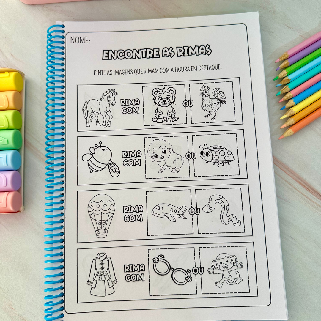 Trabalhando com Rimas – Apostila de atividades para trabalhar rimas com 85 páginas. As atividades são para colorir, e o material vai pronto para impressão.